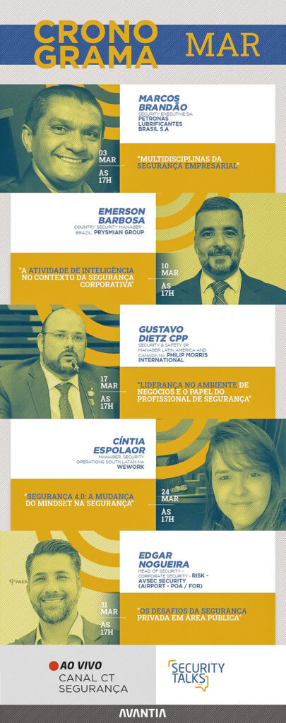 Seguindo pelo formato online, reunimos “feras” para o mês de março. Fique de olho na agenda! O programa é transmitido AO VIVO, todas as 4ªs feiras, pelo CT Segurança.